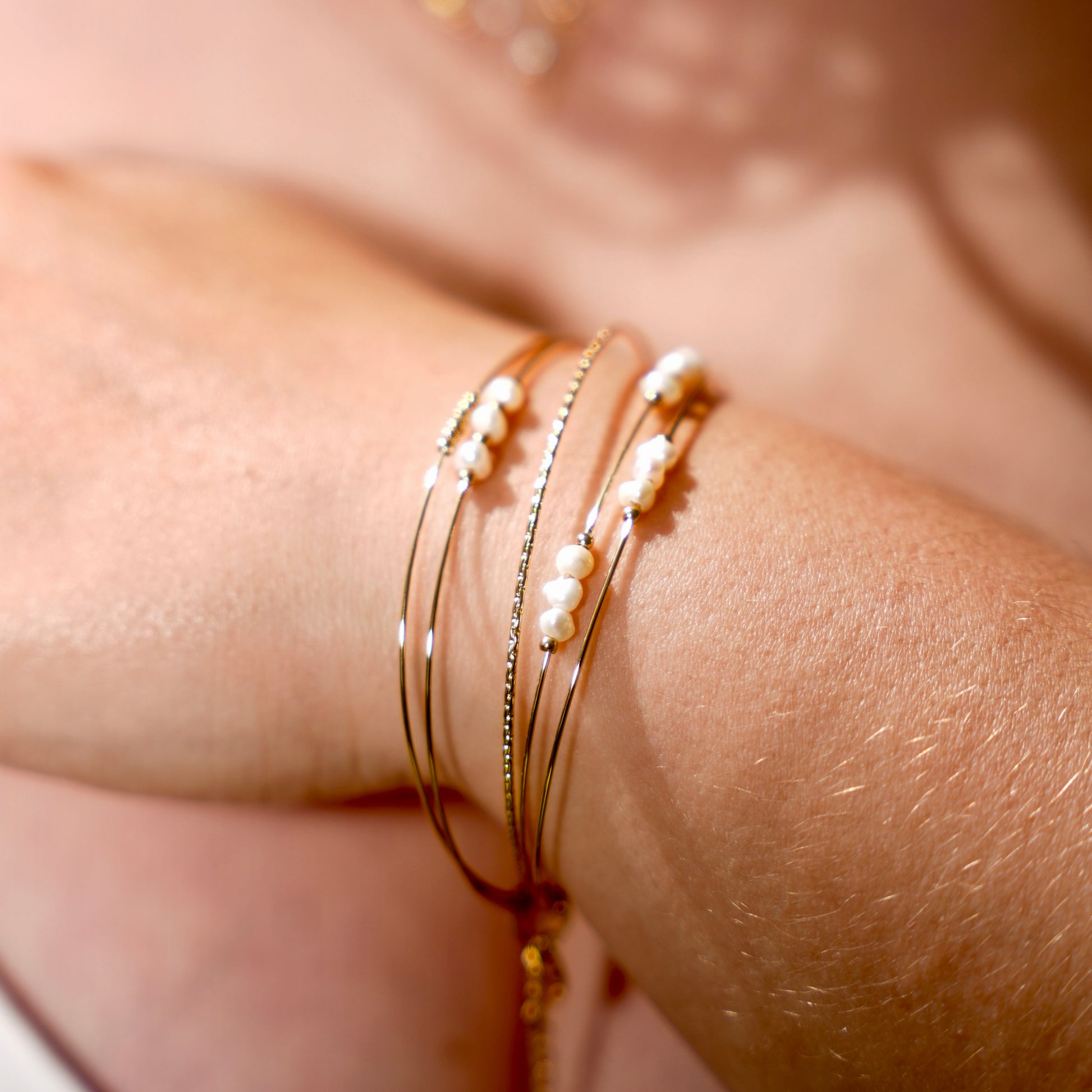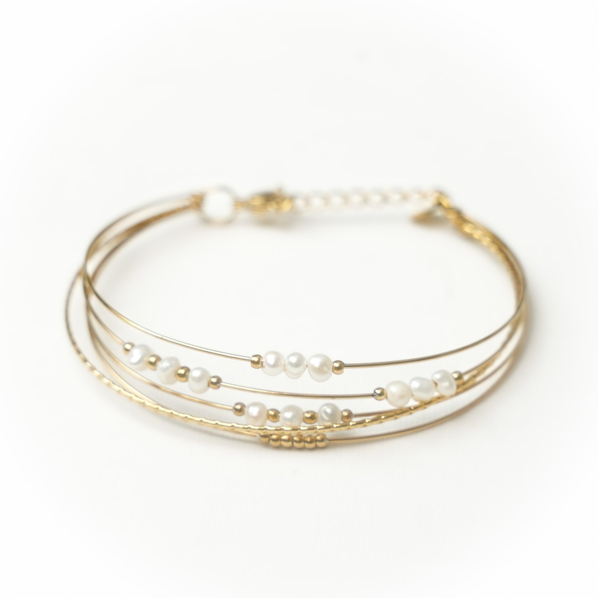 Bracelet type jonc semainier en acier inoxydable composé de 5 anneaux aux nervures dentelées, serti de pierres naturelles et de perles.